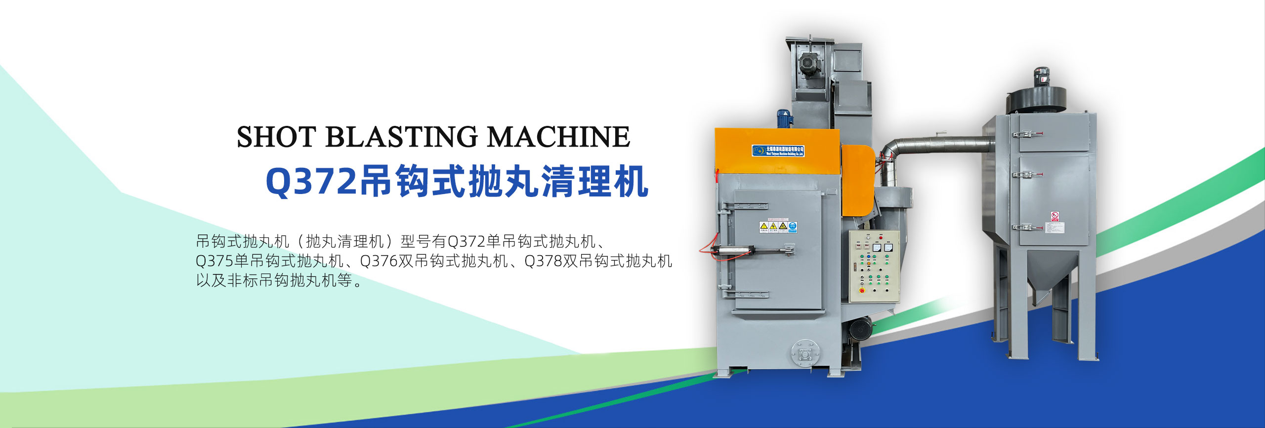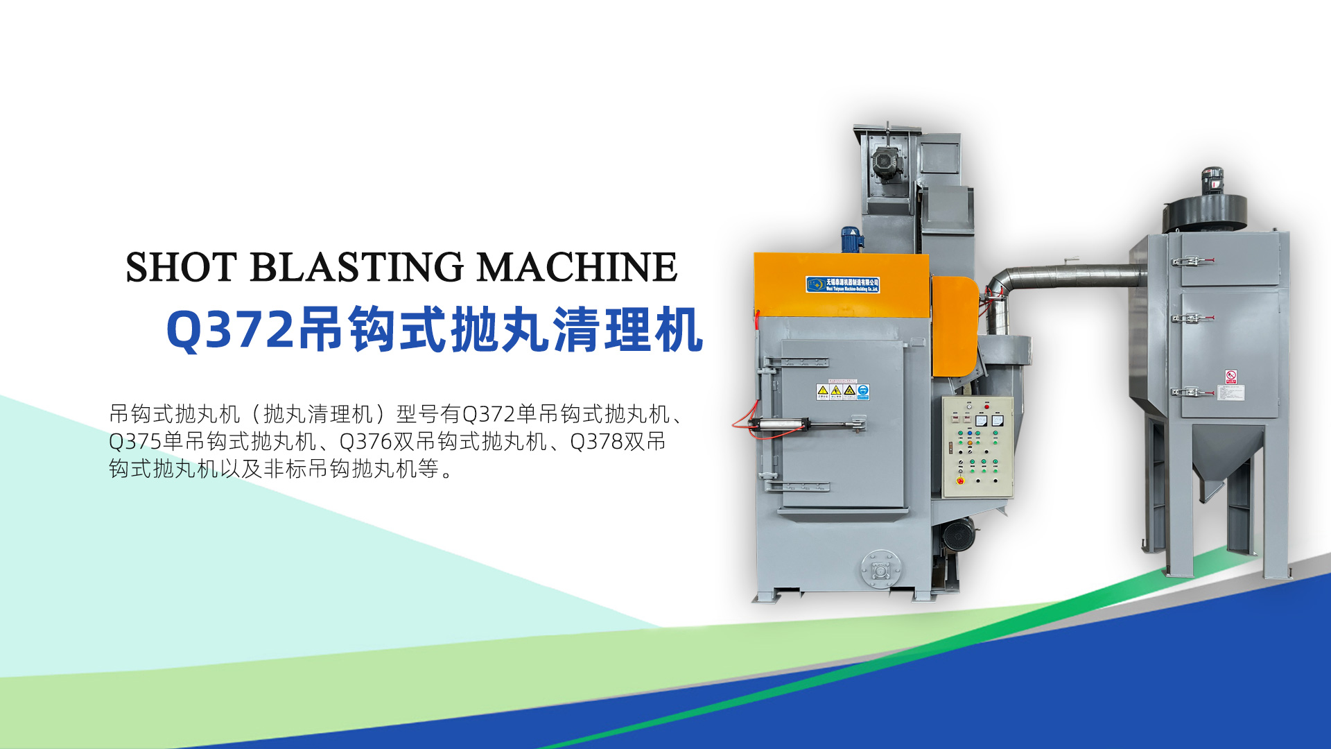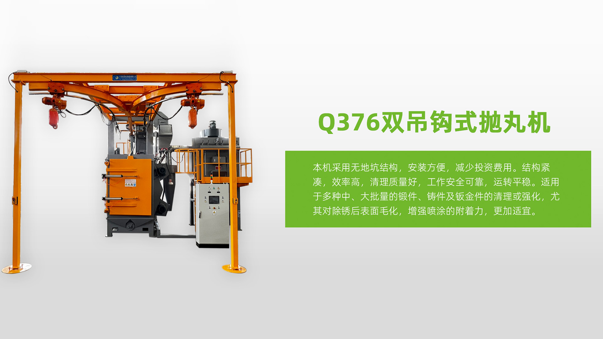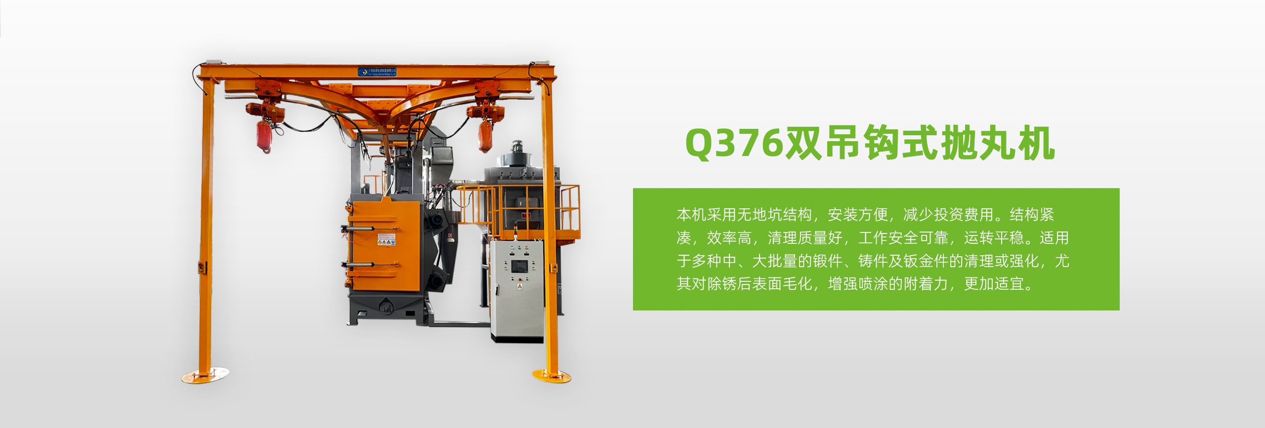 本機采用無地坑結構,安裝方便,減少投資費用。 2、 結構緊湊,效率高,清理質量好,工作安全可靠,運轉平穩。 3、 清理室采用高鉻錳板,耐磨耐沖擊,強度好。 4、 雙吊鉤結構,彼此獨立工作,互不影響,提高生產效率,吊具采用行星原理,自轉公轉同時進行,處理后的工件不存在陰陽面。 5、 二級除塵(旋風除塵,布筒過濾器),吸風量大,灰塵過濾干凈,空氣排放符合環保標準。 6、 裝配嚴謹,優質軸承、電機運轉噪音底。